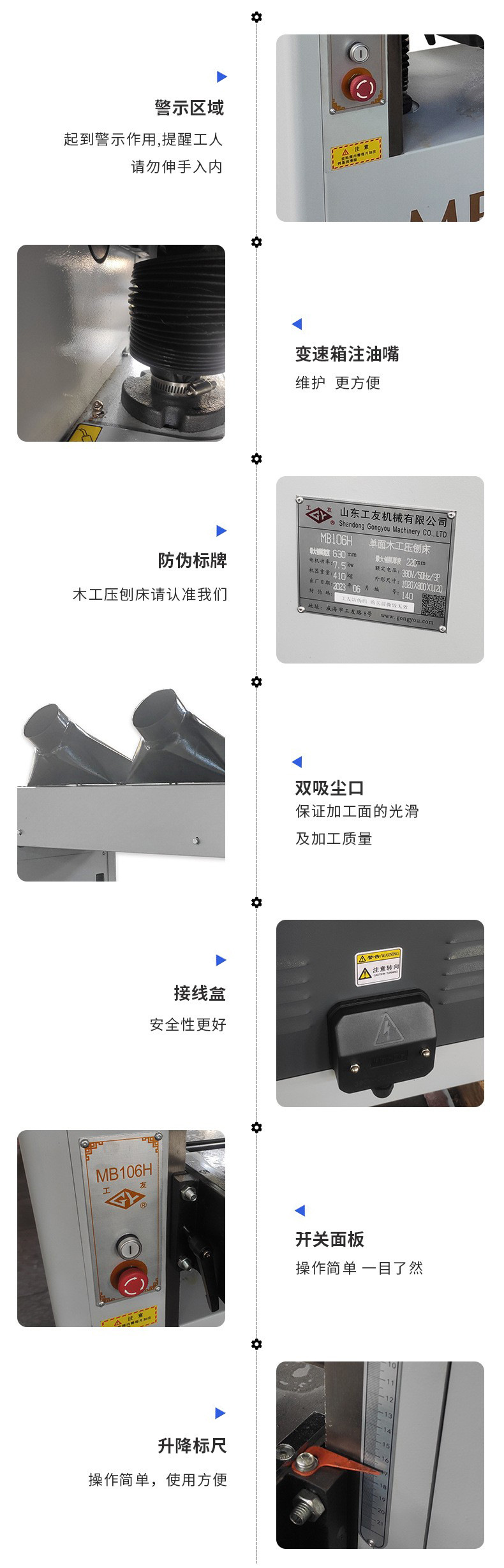 該機床送料平穩(wěn),前壓輥采用分段活動結(jié)構(gòu),可同時送入厚度相差2毫米以內(nèi)的多塊材料;前后壓料器調(diào)節(jié)方便,可加工薄板;工作臺升降裝置結(jié)構(gòu)合理,操作平穩(wěn)輕便;獨特的主軸結(jié)構(gòu),保證良好的加工質(zhì)量。該機具有兩級送料速度,可滿足不同加工工件的要求。